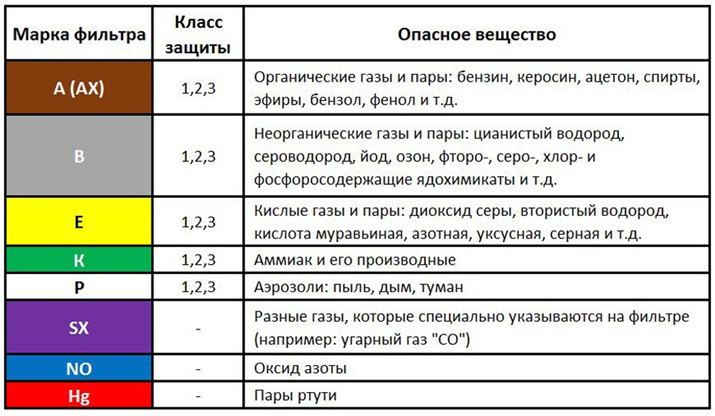 Противогазовые фильтры классифицируются по типу защищаемых веществ (маркировка буквами A, B, E, K и др. и цветом) и классу эффективности (1–3).